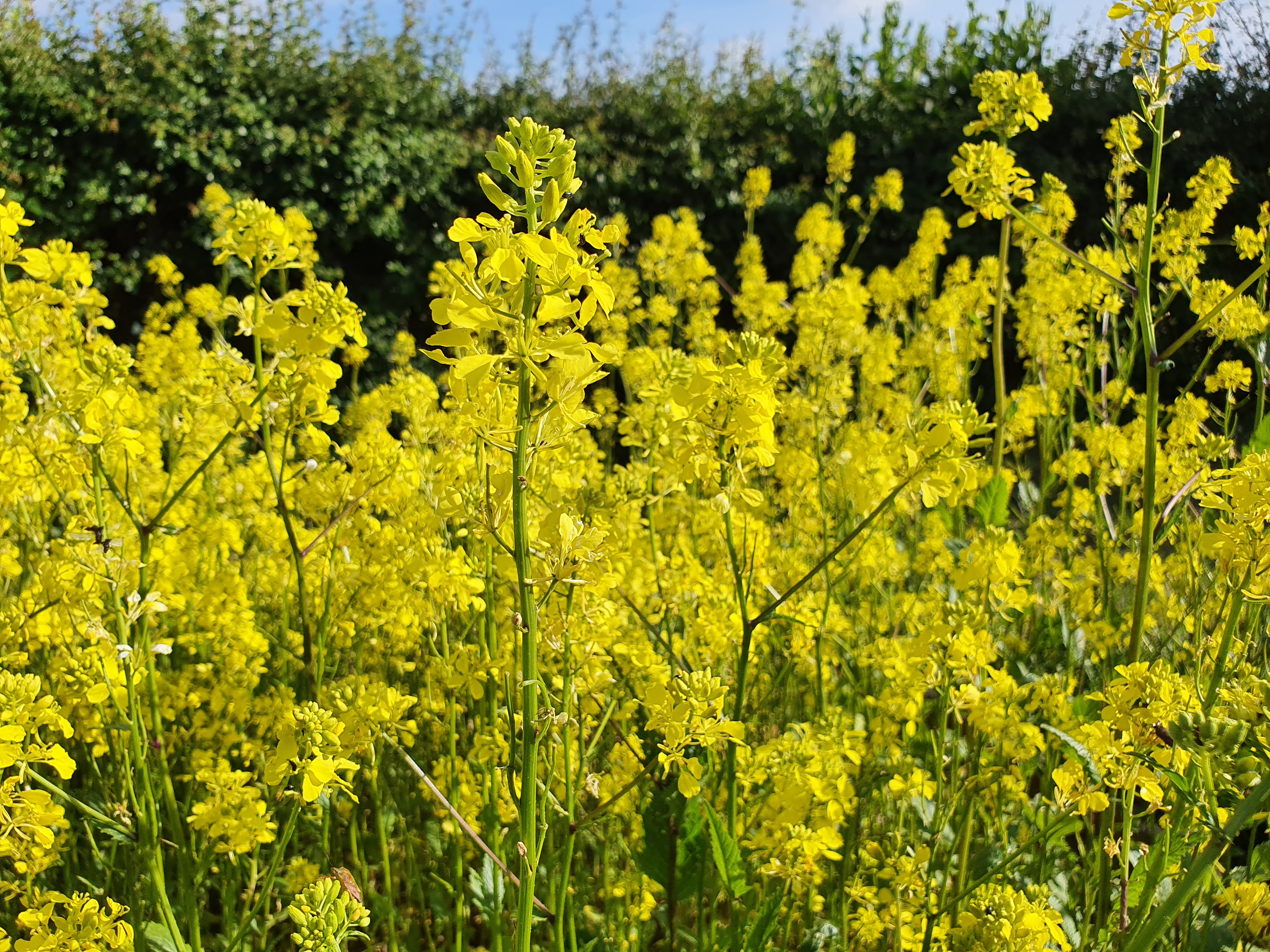 Seit Mai steht nun der Acker-Senf leuchtend gelb in Blüte, ein Kreuzblütler (Brassicaceae), der als einjährige Art zu den wildwachsenden Ackerpflanzen gehört. Erfreulicherweise konnten bereits zahlreiche Insektenarten wie Schwebfliegen, Schmetterlinge, Wanzen und Käfer u.v.m. beim Blütenbesuch beobachtet werden. Auch die seltene Blauschillernde Sandbiene (Andrena agilissima), ein Nahrungsspezialist mit Acker-Senf als Hauptpollenquelle, die in Steilwänden und lückigen Böschungen nistet, nutzte das Nahrungsangebot.