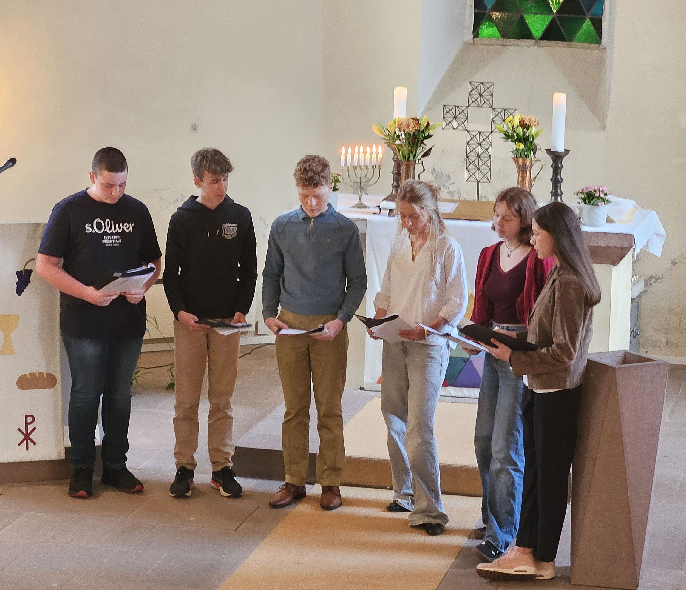Mit dieser einleitenden Bemerkung gab er das Wort weiter an die Hauptpersonen, die sich zunächst mit ihrem jeweiligen Konfirmationsspruch vorstellten. Ihre Gedanken bestimmten auch im Folgenden den Gottesdienst, sei es in ihren Überlegungen zum Thema Freundschaft, sei es in ihren Fürbitten und oder ihren Danksagungen. Dazu die gut ausgesuchten Lieder, die von Fridolin Parth an der Orgel schwungvoll begleitet wurden und ein souveräner Pastor Gerdes – alle verließen in guter Stimmung die Kirche und standen noch eine ganze Weile bei Gesprächen im Pfarrgarten.