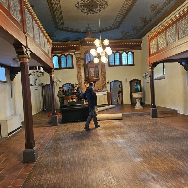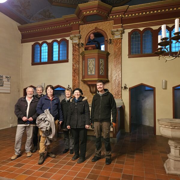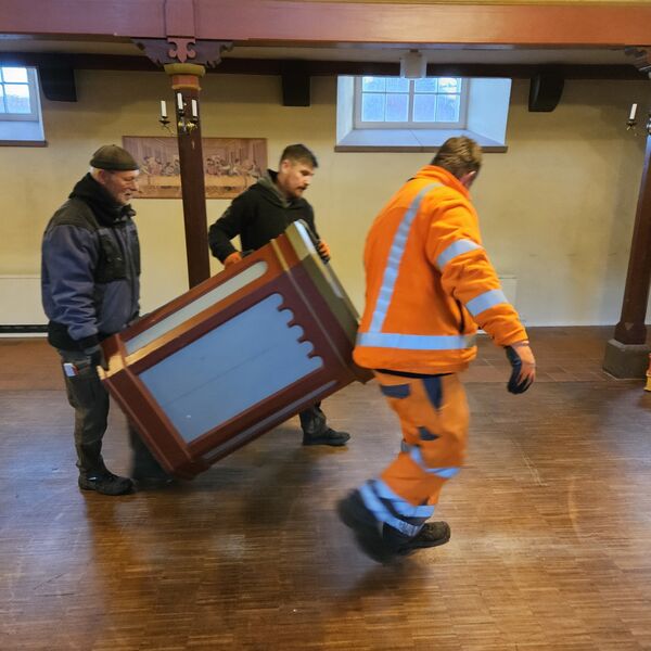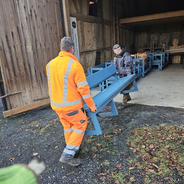 Bevor nun die Handwerker anrücken hatte die Kirchengemeinde die Aufgabe, das Innere der Kirche leer zu räumen. Am 31.1. am Nachmittag trafen sich gut ein Dutzend Personen, um diese Arbeit in Angriff zu nehmen. Und gut, dass wir so viele waren: manche Gegenstände waren schwer (die Kirchenbänke vor allen, meine Güte!!). Aber darüber hinaus waren es einfach viele, viele Dinge, die an den verschiedensten Orten der Kirche aufbewahrt und gelagert waren (Gesangbücher, Tische, Stühle, Altargeschirr, Dekomaterial, Kulissen für z. B. die Krippenspiele etc). Viele Male gingen alle Helferinnen und Helfer den Weg zwischen Kirche und Pfarrhaus bzw. den Scheunen. Diesem großen Einsatz aller Beteiligten ist es zu verdanken, dass nach knapp zwei Stunden die Kirche geräumt war.