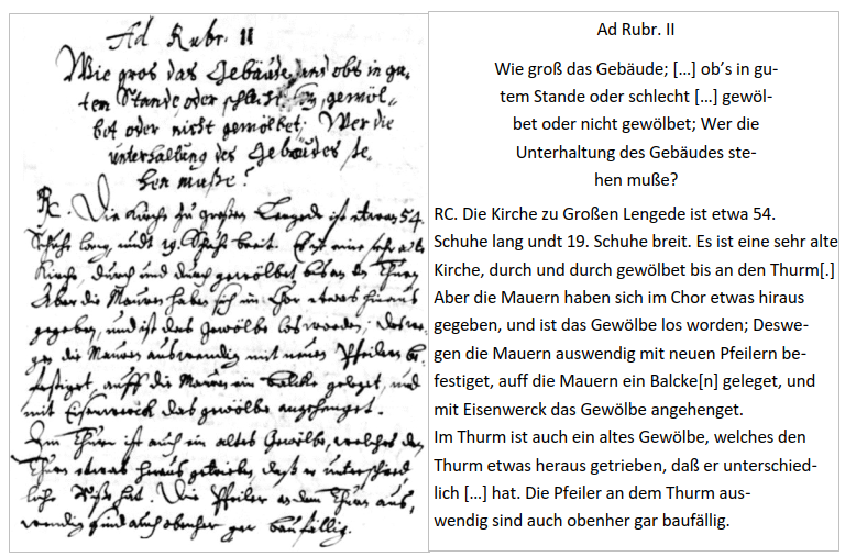 Bauschäden an der Groß Lengder Kirche sind nichts Neues. Aus dem Jahr 1670 existiert ein Schreiben, in welchem beklagt wird, dass die Kirche in Groß Lengen alt und baufällig sei. Hierbei werden die Bauform und die Schäden beschrieben. Aus diesem Schreiben wissen wir, dass es eine romanische Vorgängerkirche gab, welche über einen steinernen Wehrturm und ein Kirchenschiff mit einer Gewölbedecke verfügte. Somit muss die heutige Kirche nach 1670 errichtet worden sein. Bei der Freilegung des Westgiebels wurde eine Inschrift gefunden. Hier wird das Erbauungsjahr 1686 genannt.