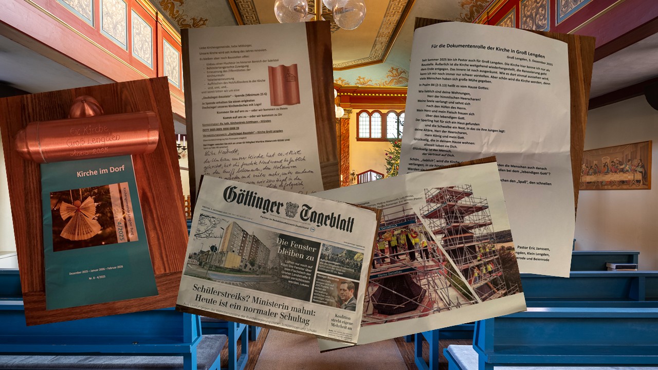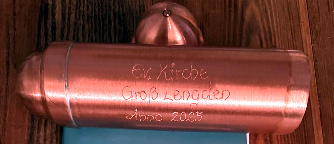 Traditionell wird bei großen Baumaßnahmen eine Zeitkapsel in den Grundstein eingelegt, bei Kirchen oft eine sogenannte Turmkugelurkunde in die Turmkugel gelegt. Fast zum Ende der Renouvirungsarbeiten (in der 50 KW wird das Gerüst abgebaut werden) wurde diese Kapsel auch für unserer Kirche in Groß Lengden bestückt.