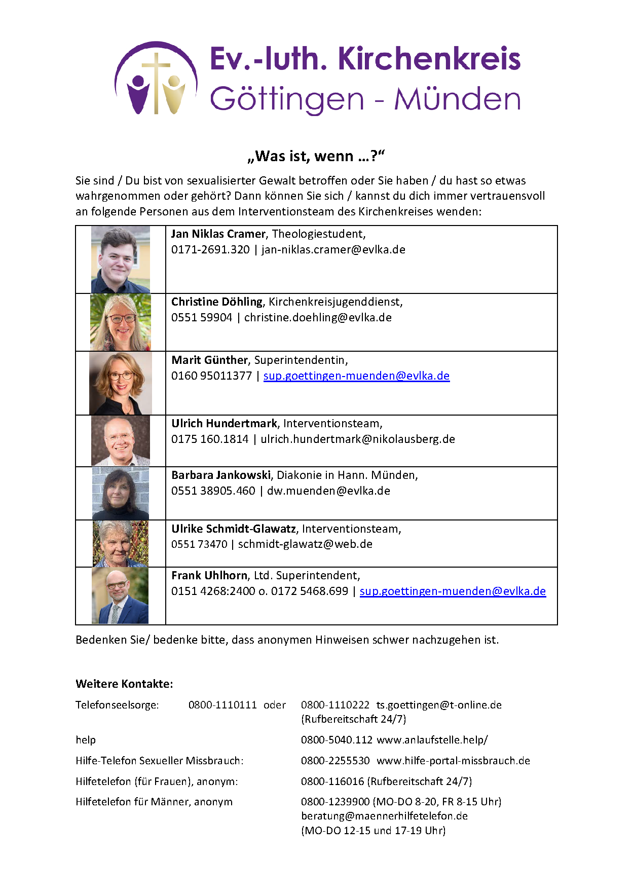 Falls Sie sich mit irgendetwas unwohl fühlen, können Sie sich gerne an die Mitglieder des Kirchenvorstandes wenden. Zusätzlich hat der Kirchenkreis ein Interventionsteam gegründet und Telefonnummern von hilfreichen Stellen zusammengestellt. Diese Angaben finden Sie unten.